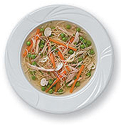 A megmosott, megtisztított tyúkot hideg vízben tedd fel főni. A forralás után keletkezett habot kanalazd le a tetejéről, majd tedd bele az egész borsot, sót, egészben a hagymát és a zellert. Lassú tűzön főzd tovább a tyúkot, amíg a húsa teljesen megpuhul. A főzés vége felé add hozzá a karikára vágott répát, petrezselyemgyökeret, zöldborsót és a gombaszeleteket. A cérnametéltet főzd ki külön a levesből kivett kevés lében.