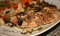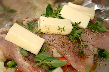 A zöldségkeveréket a batyuba halmozzuk, oda is mehet egy kis só, bors. A zöldséghalom tetejére helyezzük a kettévágott csirkemellet. A vajat rámorzsoljuk a tetejére, és rárakjuk a friss oreganót, kakukkfüvet. Ráfacsarjuk a fél citrom levét, és megöntözzük egy kis olívaolajjal. A batyu hosszabbik részét behajtjuk, megnyomkodjuk minimum négyszer. A batyu egyetlen nyitott oldalán beöntjük a bort (ha marad bor azt büszkén elfogyaszthatjuk), és behajtjuk, megnyomkodjuk minimum négyszer, és a batyu zárva.