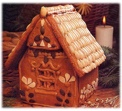 A tésztát este összegyúrjuk, hűtőszekrénybe tesszük, hogy ne ragadjon. Másnap kinyújtjuk félujjnyi vastagra. A házikó részeit papíron megrajzoljuk, kivágjuk, és a tésztára helyezzük, majd késsel körbevágjuk a formákat. A ház alapja kb. 12×20 cm legyen, ehhez arányítsuk a többi elemet. (Nagyobb darabokkal nehezebb bánni.) Kivajazott tepsibe tesszük, és a díszítéseket most helyezzük rá: a tésztából nudlikat sodrunk, és abból hajlítunk íves formákat. Az ablakot is így formázzuk. A háztetőt félbevágott mandulákkal szorosan végigrakjuk. A mandulából késsel vékonyabb szeletet is tudunk vágni, ezekkel és tökmagokkal díszítjük a házikó elejét. Végül egy egész tojást felverünk, és bekenjük a ház elemeit.