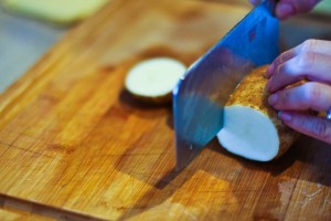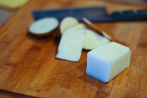 A krumplit a szokásosnál kicsit vastagabbra hámozzuk úgy, hogy szögletes alakzatot kapjunk, majd szeletelővel nagyon vékonyra vágjuk, mintha chipset sütnénk. Aki érez kellő lelkierőt, azt csinálhatja késsel is. Majd a felszeletelt krumplikat egymás mellé pakoljuk, sózzuk és meglocsoljuk az olvasztott vajjal. 180 fokos sütőben 20-25 perc alatt pirosra sütjük.