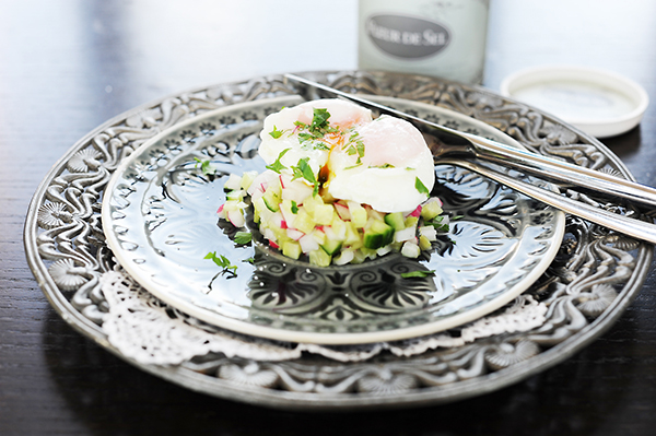 Posírozott tojás retek-uborka tatáron