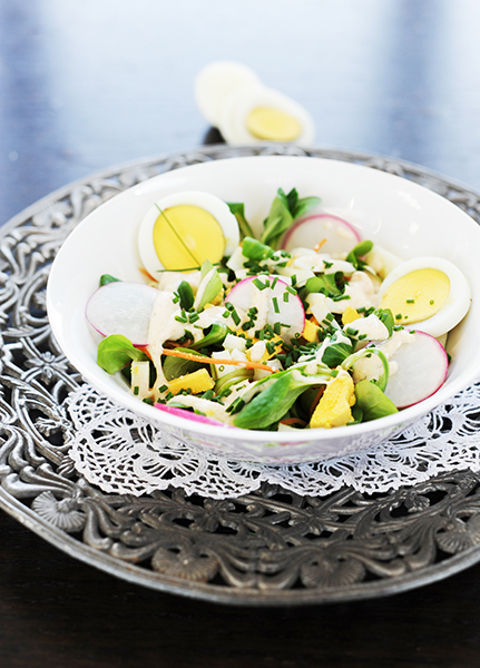 A tojásokat keményre főzzük. Az újhagymát megmossuk és felkarikázzuk. A szárzellert szintén. A natúr joghurthoz keverjük az olajat, a citrom levét, pici sót. A salátával elkeverjük a répát, a karikára vágott retket, a zellert, hozzáadjuk a felkockázott tojást, elkeverjük az öntettel, majd durvára vágjuk és tálaláskor a salátára szórjuk.
