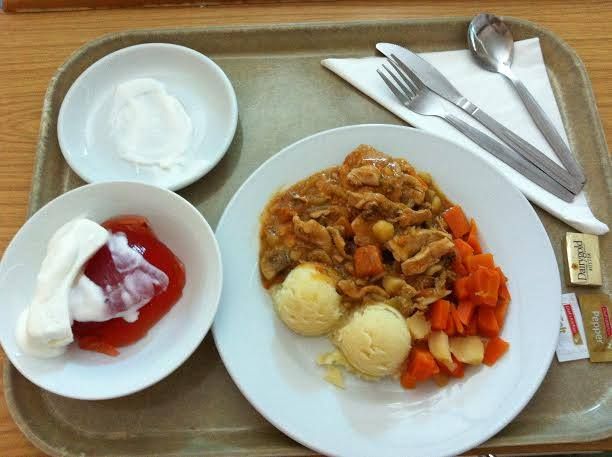 3. Egy írországi oktatókórházban kapott ilyet szülés után egy magyar kismama. „Imádtam!” – írta meg véleményét. Amit látunk, az gombás-zöldborsós-sárgarépás csirkeragu, tört krumpli, párolt sárgarépa, fehérrépa, vaj a zöldségekhez, és a kicsi fehér tányér alatt desszert: vaníliafagyi gyümölcszselével.