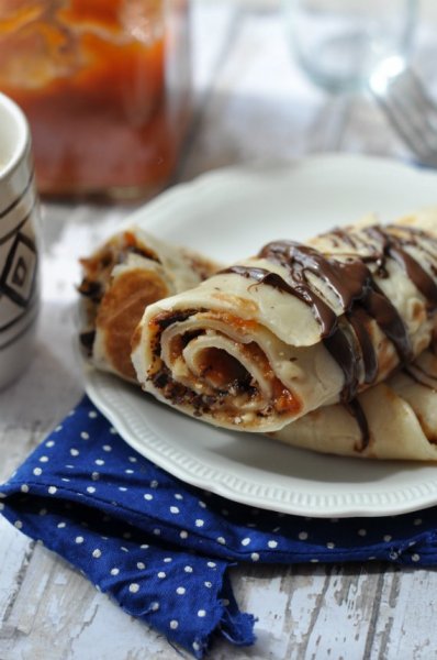 A kész palacsintákat megkenjük sárgabaracklekvárral, megszórjuk az 1-1 arányban elkevert porcukros dióval (1 evőkanál darált dióhoz 1 evőkanál porcukrot keverünk), és megszórjuk apróra vágott étcsokoládéval. Feltekerjük és – ízlés szerint – olvasztott étcsokival locsoljuk meg a kész palacsintát.