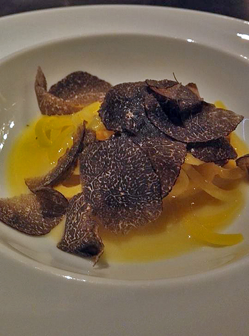 Újabb különlegesség: a szarvasgombás spagetti, amelyben a tészta valójában vékonyra szeletelt burgonya. Mindezt egy speciális, rendkívül könnyű szósszal locsolták le, ám ennek összetétele nem hagyhatta el az apró étterem falait.