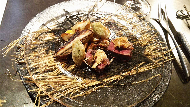 A következő fogás egy rendkívül porhanyós steak, egyenesen Hokkaido szigetéről, ez Japán legészakibb szigete. A tálalás itt is különleges: a steak alá helyezett fűszálakat tálalás után meggyújtják, a fogás ettől az utolsó másodperces hőkezeléstől éri el a tökéletes állagot.