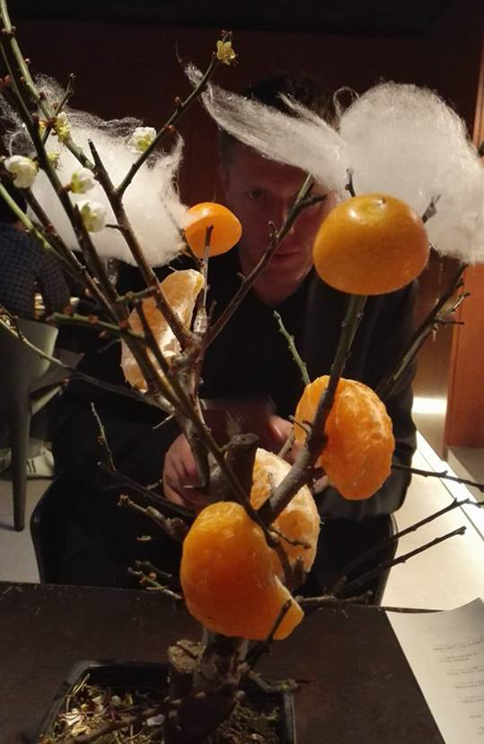 Takazawáéknál a desszertek is különlegesek: az alábbi képeken a vattacukorfa fantázianevű édesség látható, amely fehér vattacukrot és zsenge clementine mandarint takar. A szögletes üvegdobozban tálalt fogás pedig hajszálvékonyra szelt epret és ízben hozzá illő sörbetet takar.