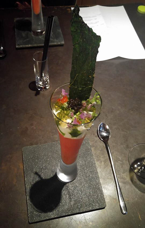 Egy másik leves: az elegáns pezsgőspohárban tálalt gazpacho, a tetején parmezánból készült krémmel és zsenge zöldségekkel. A furcsa, fakéregre emlékeztető dolog szárított falevél, amelyet különleges fűszerekkel dörzsöltek be. Állaga ellenére azonnal elolvad az ember nyelvén, így egészítve ki a zöldségleves ízeit.