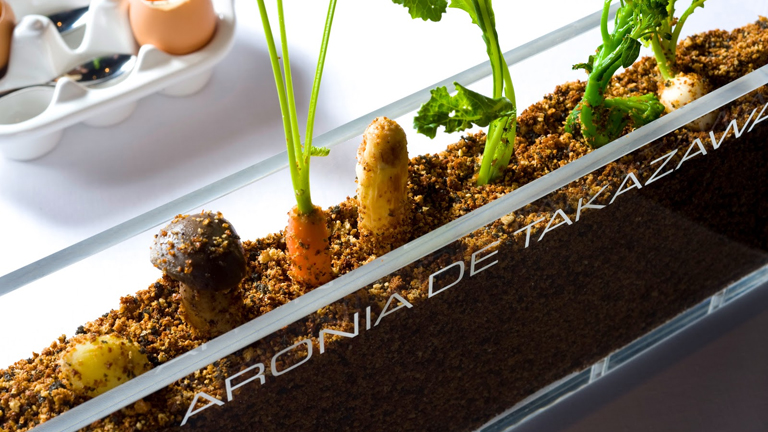 De folytassuk a menü elemzését: a zöldséges ételek rajongói bizonyára előszeretettel fogadnák a Takazawa’s Farm elnevezésű kompozíciót, amelyben friss, helyi zöldségek – répa, gomba spárga – kaptak helyet. Ezeket pirított kenyérmorzsába állítják, mintha egy virágláda földjéből serkennének ki a friss zöldek. Mellé indiai fűszerek, sűrű szójaszósz és hideg, szűrt gombaleves érkezik, illetve egy tojáshéjban tálalt, libamájjal és szarvasgombával ízesített apró adag rántotta.