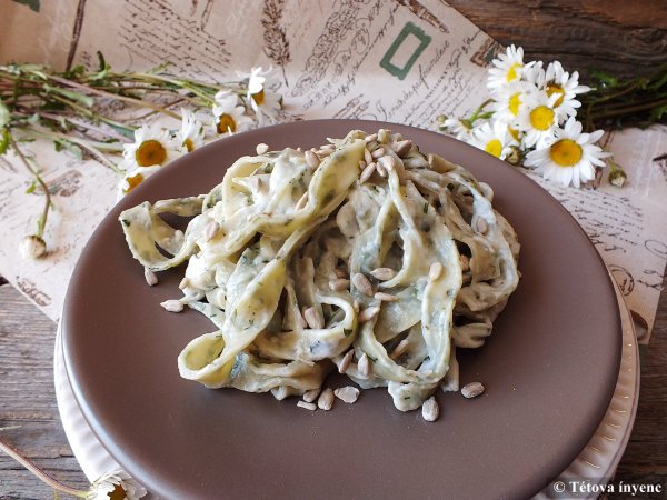 Zöld fűszeres széles metélt gorgonzolás mártással