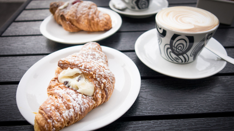 Kapucsínó és cornetto – mi mással indulhatna az olasz reggeli, mint egy csésze kávéval és a cornetto névre keresztelt, valamilyen krémmel vagy lekvárral töltött croissant-nal.