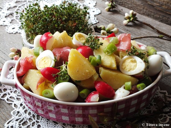 Egy húsvéti jellegű, tartalmas saláta lett végül az eredmény, ami önmagában is elég a jóllakáshoz, de akár a húsvéti asztal része is lehet. Húsvét után pedig maradékfelhasználásra is alkalmas. Fürjtojás helyett megteszi a tyúktojás is, csak a méret (s a látvány) lesz más.”