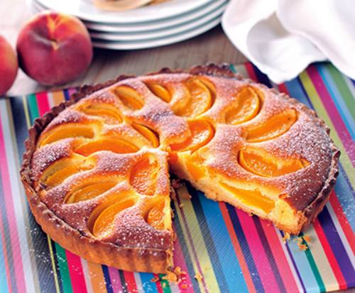 A töltelékhez a cukrot és a tojásokat gépi habverővel felhabosítjuk, majd belecsurgatjuk az olvasztott vajat, hozzáadjuk a darált mandulát. Megtöltjük vele az elősütött pitét, és szépen belenyomkodjuk a cikkekre vágott barackokat. 20-25 perc alatt készre sütjük.
