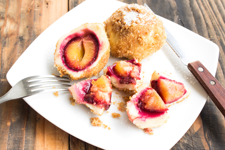A krumplit meghámozom, felkockázom, megfőzöm. Amíg fő a krumpli, addig óvatosan kimagozom a szilvát, kikeverem a fahéjat a cukorral.