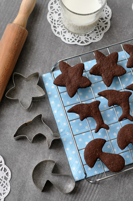 A hűtőből elővett tésztát lisztezett gyúródeszkán kinyújtjuk – vagy a kisinassal kinyújtatjuk:) –, és kekszkiszúrókkal különféle formákat szaggatunk belőle. Kb. 12 perc alatt készre sütjük, a tepsin hagyjuk kihűlni.