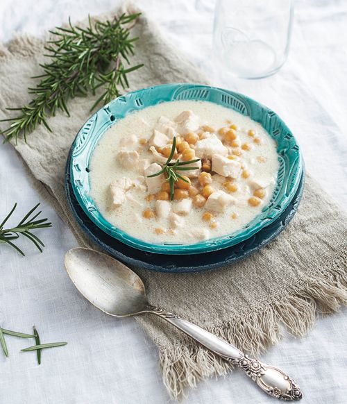 A csicseriborsót egy nappal előtte beáztatjuk enyhén sós vízbe. (Ha konzerv, előfőzött csicseriborsóból készítjük, nem kell beáztatni, és a főzési idő is lerövidül.) A hagymát és a fokhagymát megtisztítjuk, finomra vágjuk, majd kevés olívaolaj és vaj keverékén megpirítjuk. Amikor színe lesz, felengedjük 2 dl vízzel, és botmixerrel összepürésítjük. Hozzáadjuk a csicseriborsót, sózzuk, borsozzuk, beledobjuk a rozmaringot, és felöntjük még 5 dl vízzel. Addig főzzük, míg a csicseriborsó megpuhul (kb. 30 perc). Beletesszük az előzőleg kockára vágott csirkemellet, majd forralva 5 perc alatt készre főzzük. Hozzáadjuk a tejszínt, összemelegítjük (már nem forraljuk), majd kiszedjük belőle a rozmaringot. Tálaláskor díszíthetjük friss petrezselyemmel, snidlinggel.