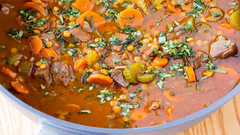 Egy nagyobb fazékban hevítsük olajat, pirítsuk meg rajta kicsit a hagymát és a fokhagymát, majd adjuk hozzá a kockára vágott marhahúst is! 5-10 perc alatt kérgesítsük a húst! Adjuk hozzá a répát, a zellert, a lencsét és a paradicsomot majd öntsük fel az alaplével és a borral. Tegyük bele a fűszereket is! A levest forraljuk fel, 45-60 percig hagyjuk rotyogni. Ellenőrizzük, hogy a lencse és a hús is megpuhult-e!