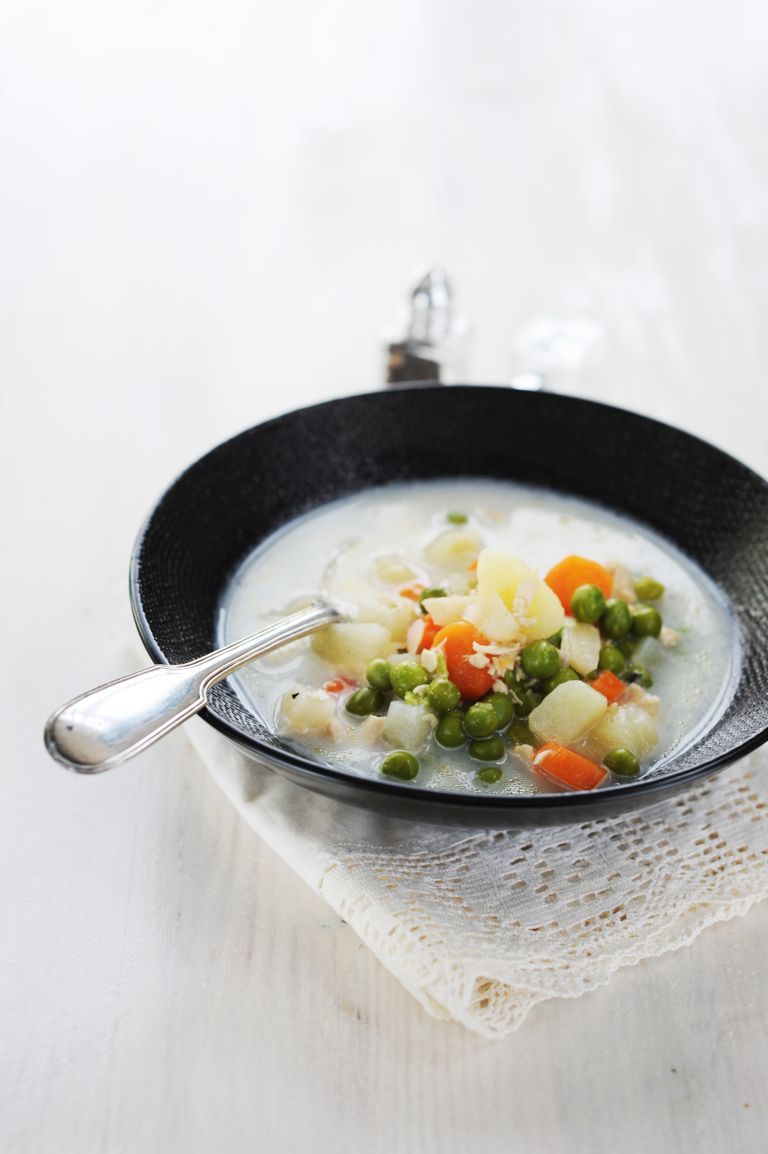 A felhevített olajon az apróra vágott hagymát üvegesre párolom, majd hozzáadom a felkockázott csirkemellet, fehéredésig pirítom, és felöntöm vízzel. Felforralom, leszedem a habját, majd hozzáadom a felkarikázott répát és gyökeret, valamint a felkockázott karalábét. Sózom, frissen őrölt borssal és tárkonnyal ízesítem, és 10 percig főzöm. Hozzáadom a borsót és a reszelt fokhagymát. Amikor már majdnem minden alkotórész megfőtt, beleöntöm a tejszínt, valamint a vége előtt ízesítem a citrom levével.