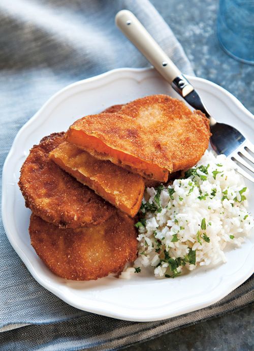 A tököt meghámozzuk, 3 mm vékonyan felkarikázzuk. Hogy szép, egyforma karikáink legyenek, használjuk ehhez a recepthez a tök hosszú nyakát. Hagyományos módon panírozzuk: először lisztben, majd felvert tojásban, majd zsemlemorzsában forgatjuk meg, és bő, forró olajban mindkét oldalát ropogósra sütjük.