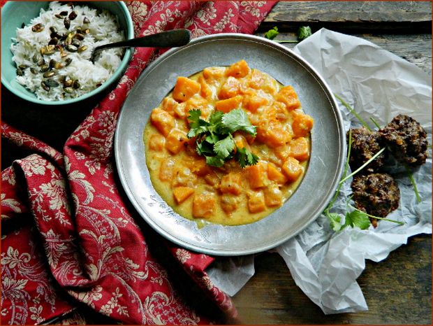 Kókuszos-currys sütőtökfőzelék tökmagos basmati rizzsel