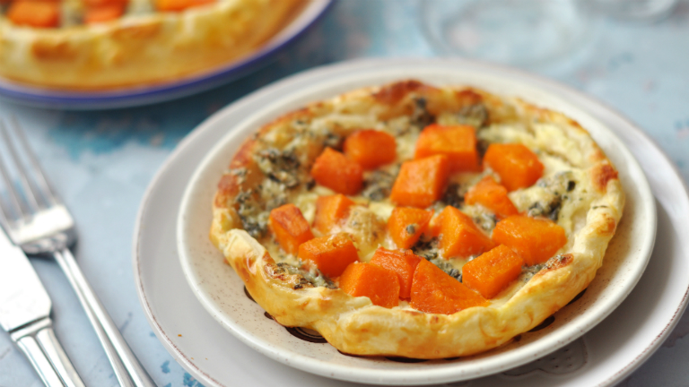 A tésztalapokat krémsajttal kenjük meg, úgy, hogy a széleken kb. 1 cm-es peremet hagyunk, rászórjuk a sütőtökkockákat, és kéksajtot morzsolunk a tetejére.