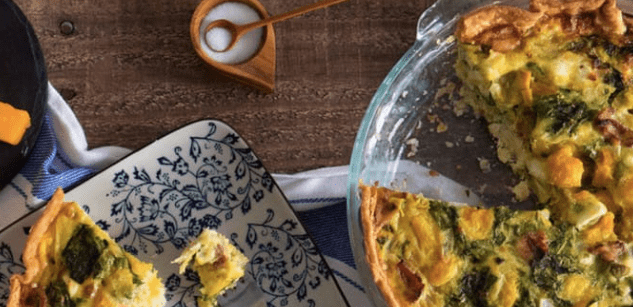 A megsült bacont, a megpárolt hagymát és a sütőtököt keverd a tojásos mixhez.