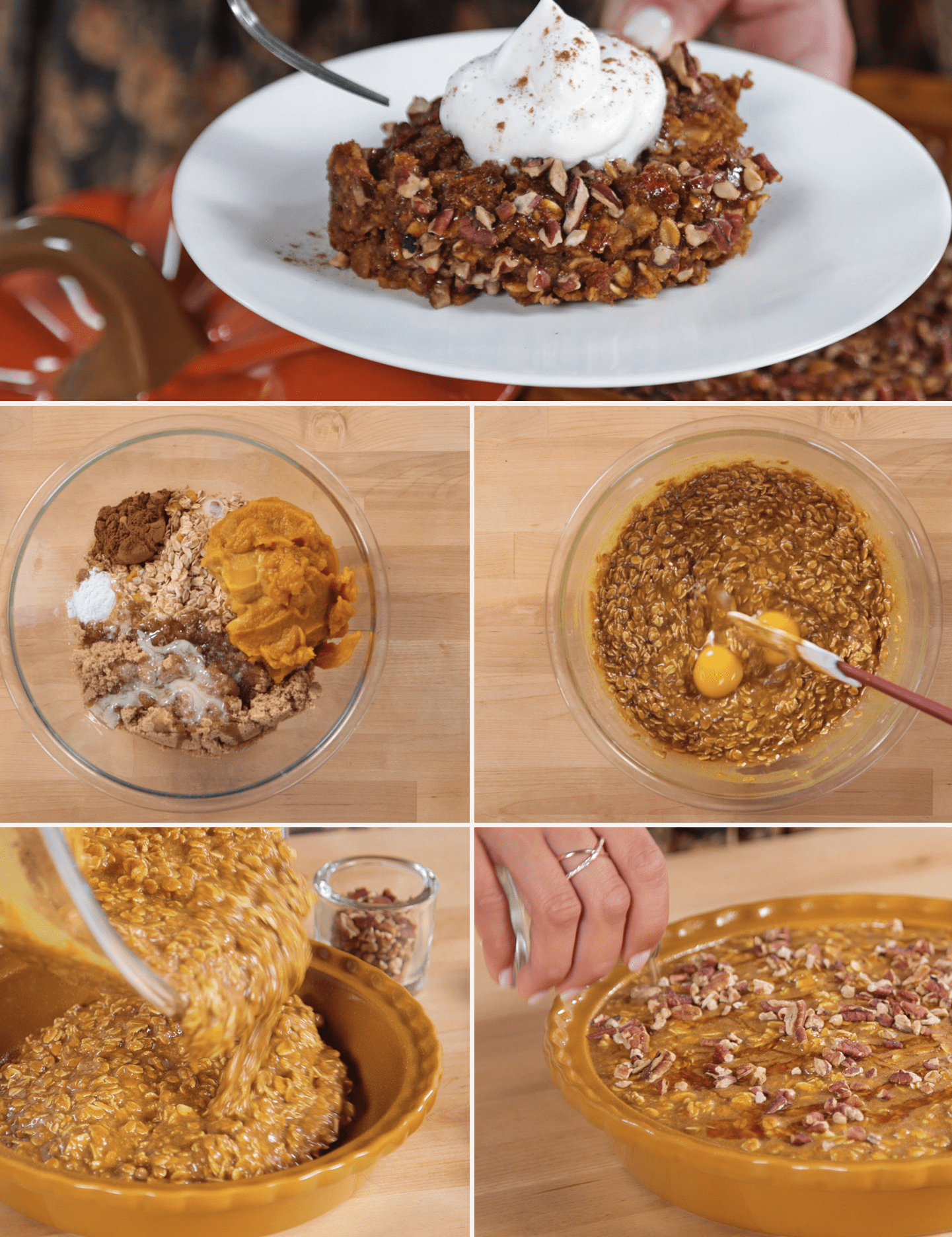 Egy nagy tálban keverd össze a zabpelyhet, a cukrot, a sütőport, a fűszerkeveréket, a sót, a sütőtökpürét, a tejet és a vajat. Végül add hozzá a tojást is. Alaposan keverd össze.
