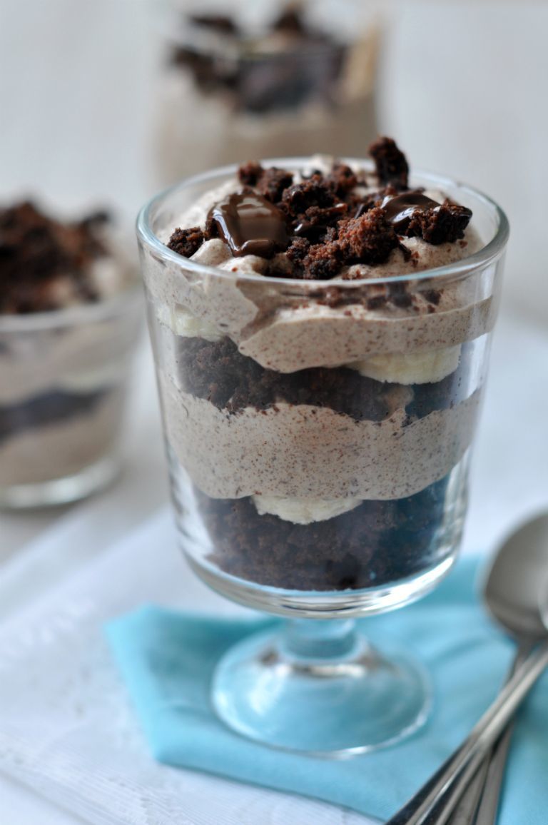 1-2 dl-es poharakat készítünk elő, és összeállítjuk a desszertet: a pohár aljába morzsát szórunk, ráhelyezünk pár szelet banánt, majd egy adag csokis tejszín következik. Ezután ismét csokimorzsa, banán és krém következik, egészen a pohár tetejéig. A tetejére morzsát szórunk, a maradék 5 dkg étcsokit megolvasztjuk, és abból is csepegtetünk rá.
