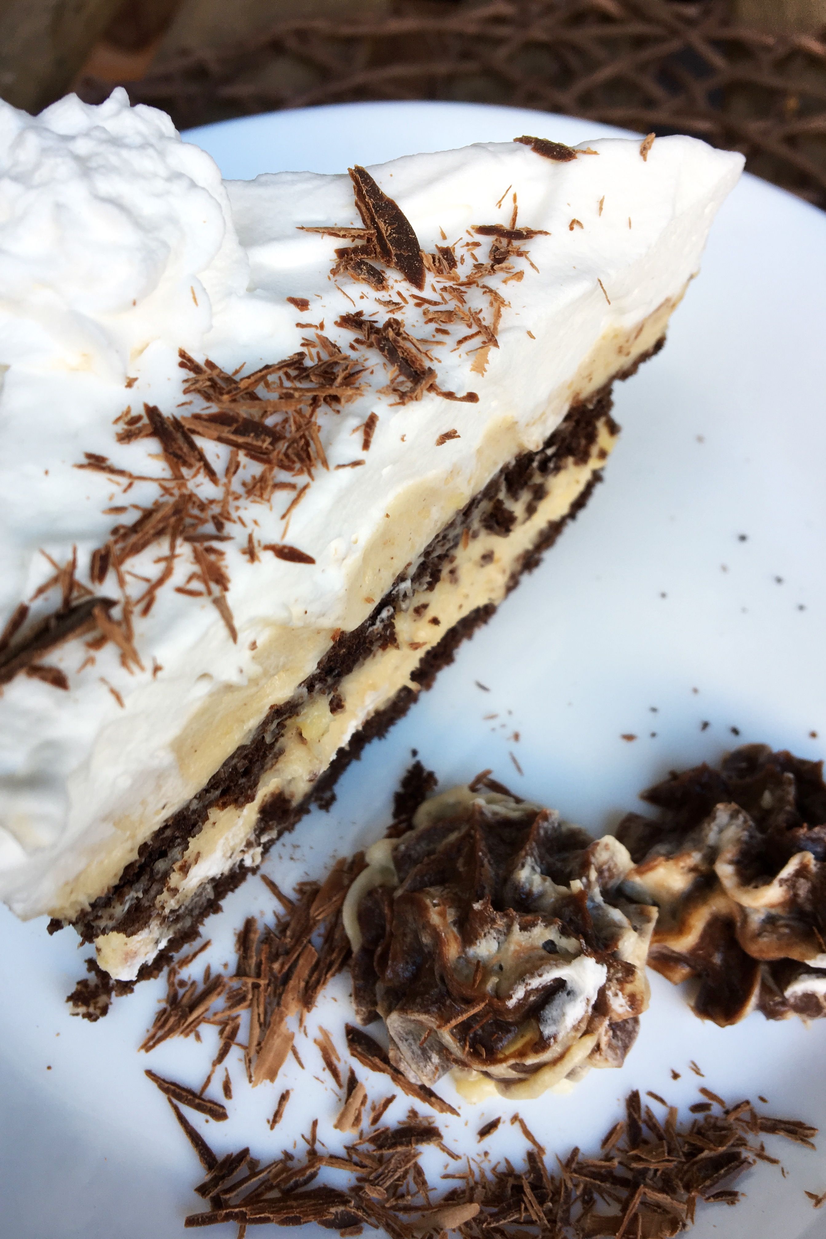 A habtejszínt kemény habbá verjük, közben fokozatosan hozzáadjuk a porcukrot is. Az enyhén kihűlt – de nem dermedt – étcsokoládét elkeverjük a felvert tejszínhabban. A kakaós piskótát kézzel szétmorzsoljuk, a banánt felszeleteljük.