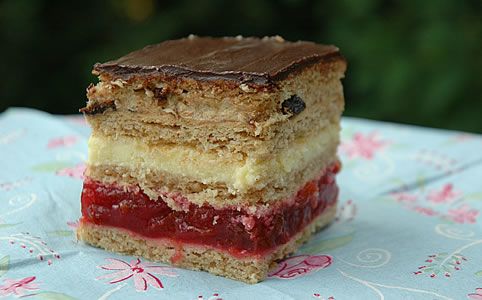 Az alsó krémréteget a következőképp készítsük el: 80 dkg szilvát daraboljunk apró kockákra, majd 8 dl vízzel, 20 dkg cukorral és egy kiskanál fahéjjal főzzük puhára. Várjuk meg, amíg kihűl, majd a főzött szilva levével keverjünk ki 2 csomag vaníliás pudingot, adjuk hozzá a szilvadarabokat is, és addig főzzük, amíg sűrű krémet kapunk. Ezután a krémet kenjük két lap közé, és hagyjuk teljesen kihűlni.