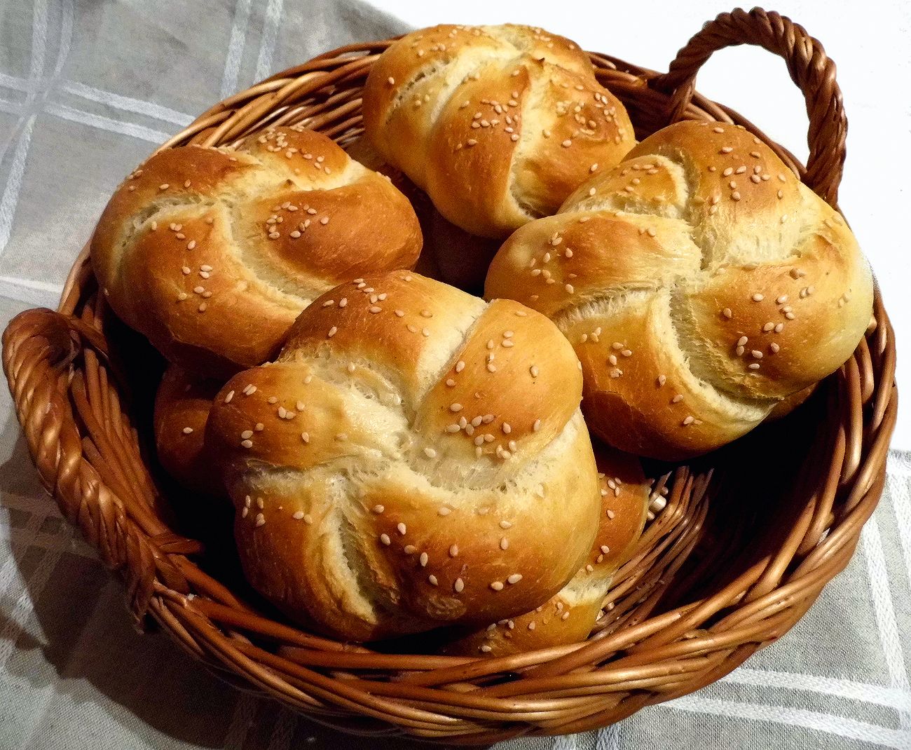 Kibélelünk két nagy sütőlemezt sütőpapírral, és a megformázott zsemléket egymástól kissé távolabb ráfektetjük. A tepsiket letakarjuk, 30-40 percig pihenni hagyjuk a zsemléket, közben a sütőt előmelegítjük 200 °C-ra. A megkelt zsemléket alaposan lepermetezzük vízzel (legjobb egy virágpermetezővel). Megszórjuk szezámmaggal, majd megint lepermetezzük vízzel, így a magok nem fognak leesni.
