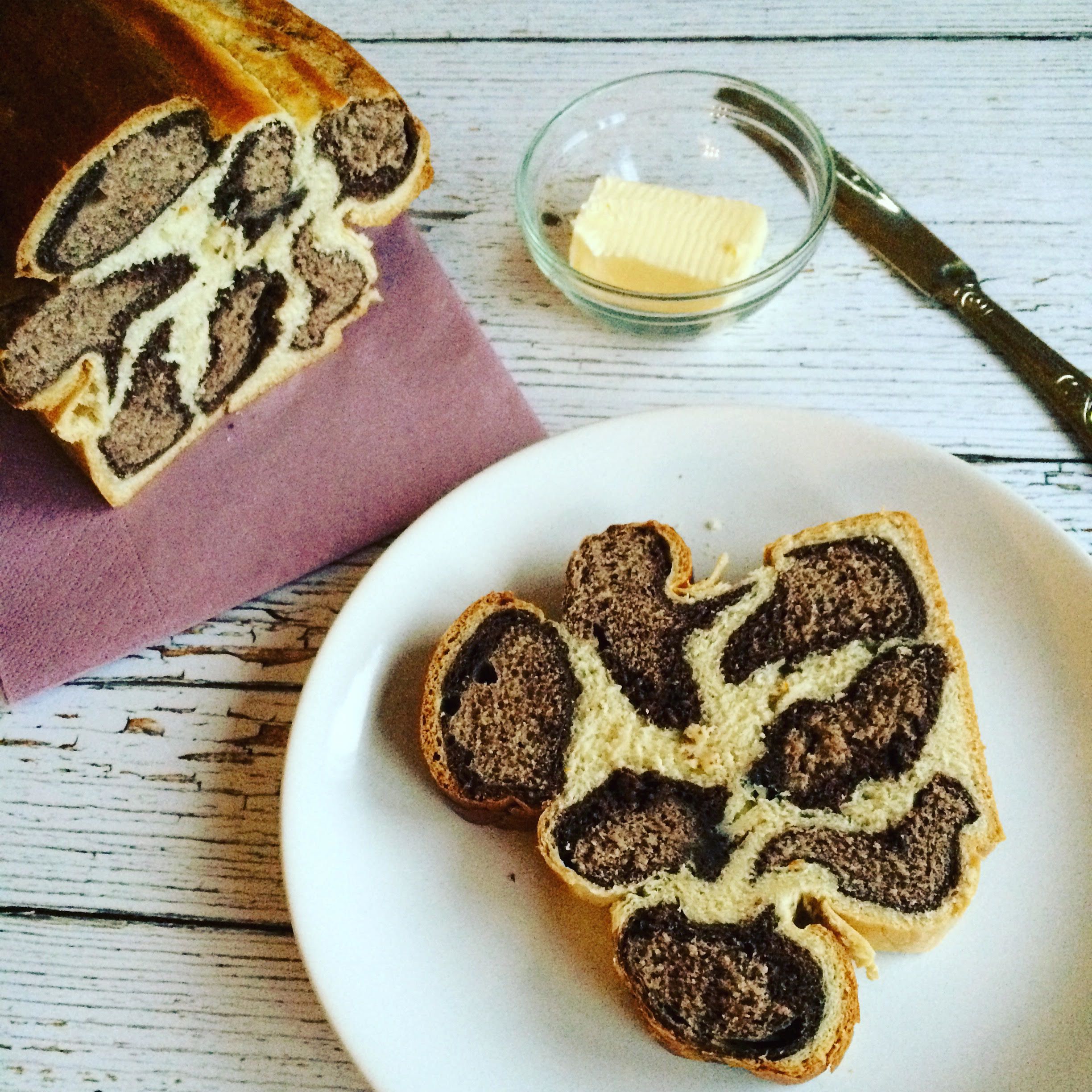 A megkelt tésztát hét egyforma részre vágtam, és kis gombócokat formáztam belőle. A világos barna tésztából hosszú rudakat formáztam. Kinyújtottam a sötétbarna tésztát, és beletekertem a világosbarnát. Majd kinyújtottam a világos tésztát is, és szintén beletekertem a barna tésztát.