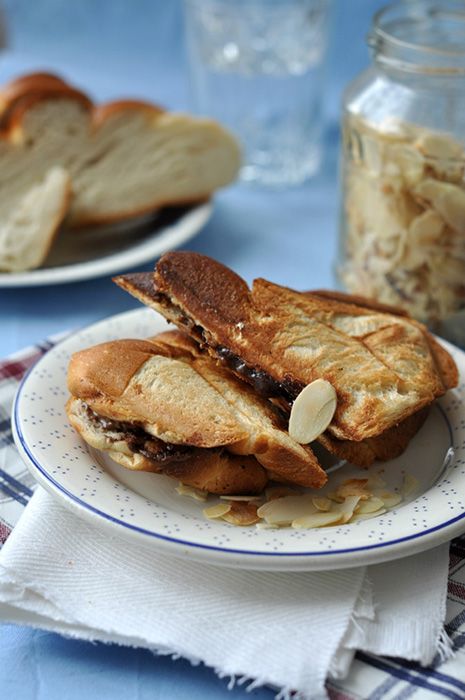 A kalácsot vékony szeletekre vágjuk, a banánt felszeleteljük. A kalácsszeleteket megkenjük Nutellával, ráhelyezzük a banánkarikákat, és szeletelt mandulával szórjuk meg. Két megpakolt kalácsszeletet összefordítunk, és szendvicssütőben megsütjük.