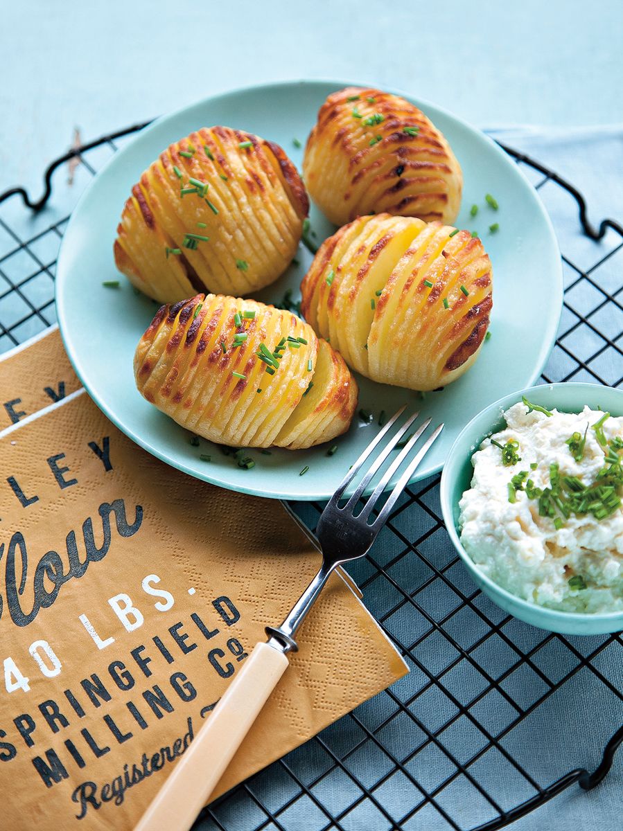 A burgonyákat hámozzuk meg, éles, vékony pengéjű késsel vagdossuk be őket vékony szeletekben körülbelül a 2/3 részükig úgy, hogy az aljuk egyben maradjon. Olvasszuk fel a vajat, keverjük el az olívaolajjal, az aprított fokhagymával és a sóval. Kenőtollal kenjük meg a vajas keverékkel a krumplikat, a rések között is, majd tegyük őket sütőpapírral bélelt tepsire. 230 ˚C-on, 40-45 perc alatt süssük készre. Időnként kenjük meg a krumplik tetejét a lecsöpögött vajjal. A krémhez a juhtúrót keverjük el a tehéntúróval, a tejföllel, a vágott snidlinggel, borsozzuk és sózzuk, ha szükséges. Kínáljuk a krumpli mellé.