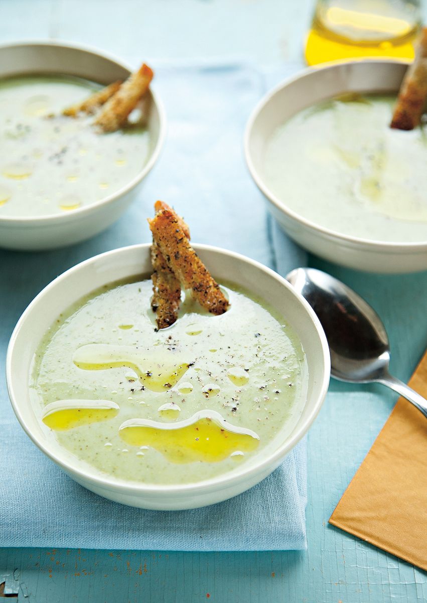 A kelbimbókat hámozzuk meg, felezzük el. 3-4 evőkanál olívaolajon pároljuk félig puhára. Öntsük fel 1 liter vízzel vagy zöldséglevessel, adjuk hozzá a majoránnát, 1 gerezd zúzott fokhagymát. Főzzük puhára a kelbimbót. Ha puha, turmixoljuk le, adjuk hozzá a főzőtejszínt, sózzuk, borsozzuk, tegyük hozzá a másik gerezd zúzott fokhagymát. Forraljuk még egyszer össze a levest. A kenyeret vágjuk hasábokra (lehet kockázni is). Egy serpenyőt hevítsünk fel, öntsünk bele kevés olívaolajat, tegyük bele a zöld fűszereket, sót. Kicsit pirítsuk meg a fűszereket, majd tegyük bele a kenyérrudakat, és enyhén pirítsuk meg őket. Szedjük papírtörlőre, hogy leitassuk róla a felesleges olajat, majd kínáljuk a krémleveshez.