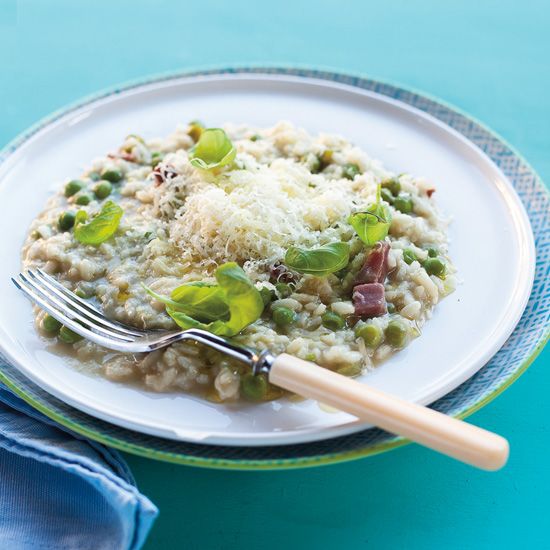 A felkockázott hagymát olajon dinszteljük meg, adjuk hozzá a felkockázott szalonnát, enyhén pirítsuk meg. Tegyük bele a zöldborsót, pár percig pároljuk, majd öntsük hozzá a rizst. Ha üvegesedni kezd a rizs, öntsük hozzá a bort, és folyamatosan keverjük. Amikor a rizs magába szívta a bort, adjunk hozzá egy merőkanál alaplevet, keverjük. Ezt addig végezzük, míg az alaplé elfogy. (Mindig várjuk meg, amíg felszívta a levet, csak ezután jöjjön a következő merőkanál lé.) Ha megfőtt a rizs (18-20 perc), adjuk hozzá az utolsó adag levet, de ne főzzük el teljesen. Keverjünk hozzá a vajat és a reszelt parmezánt, azonnal tálaljuk. Tálaláskor locsoljuk meg olívaolajjal, szórjuk meg parmezánnal.