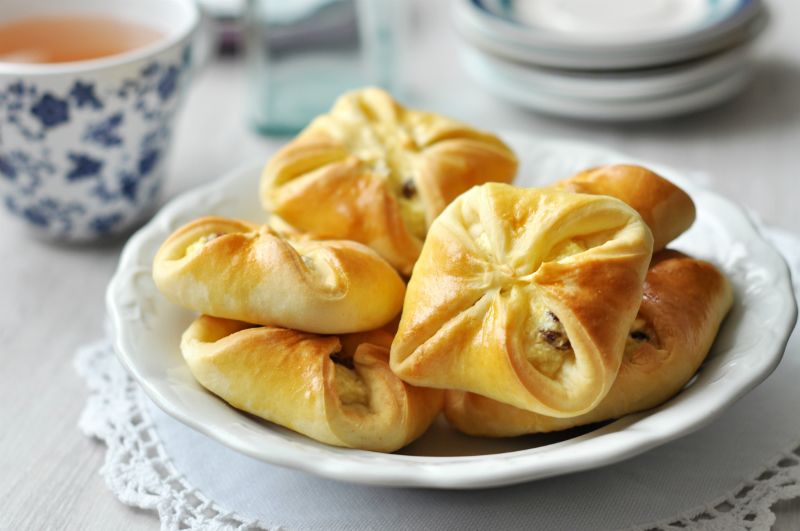 Az élesztőt 1 dl, kevés cukorral elkevert langyos tejben felfuttatjuk. A lisztet egy tálba szitáljuk, hozzáadjuk a cukrot, és a sót, majd a közepébe mélyedést készítünk, és hozzáadjuk a tojást, a maradék tejet, majd az élesztős tejet. Dagasztani kezdjük, majd hozzáadjuk a puha vajat, és beledolgozzuk. Ha már nem ragad a tálhoz a tészta, gombócot formázunk belőle, és letakarva, meleg helyen kb. 45 perc alatt duplájára kelesztjük. A mazsolát vízbe áztatjuk. A töltelékhez a túrót villával áttörjük, hozzáadjuk a cukrokat, a búzadarát és a tojások sárgáját. Lecsepegtetjük a mazsolát, és a masszához keverjük. A tojások fehérjét habbá verjük, és óvatosan összeforgatjuk a túrós keverékkel. A megkelt tésztát lisztezett gyúródeszkán kinyújtjuk – kb. 50×60 cm-es méretű téglalappá, amiből 10×10 cm-es darabokat vágunk. Minden tésztadarab közepére teszünk 1 evőkanálnyi túrós tölteléket, majd a négyzetek sarkait felhajtjuk, és középen, ahol összeérnek, kicsit csavarunk rajtuk egyet. Sütőpapírral bélelt tepsire helyezzük a batyukat, és letakarva kb. 20 percig pihentetjük, majd tojással kenjük le a tetejüket, és 180 fokra előmelegített sütőben kb. 20 percig sütjük.