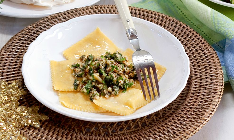 A raviolihoz a durumlisztet keverjük el egy csipet sóval, a tojássárgájával, az olívaolajjal és annyi vízzel, hogy összeálljon a tészta. Gyúrjuk simára, felezzük meg, és nyújtsunk belőle két vékony lapot. Az egyikre helyezzünk egymástól 3-4 cm-re sajtkockákat, és tegyük rá a másik kinyújtott tésztalapot. A töltelék körül nyomjuk össze alaposan a két tésztaréteget, majd derelyevágóval vágjunk négyzeteket.