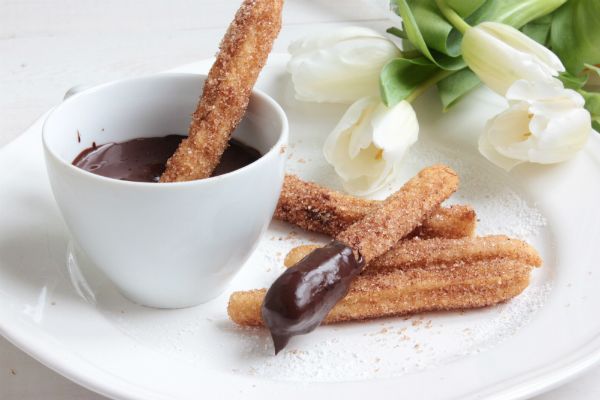 A nyomózsákból a forró olajba nyomunk 10 cm hosszú csíkokat, majd ollóval levágjuk. Addig süssük, míg szép aranybarnák lesznek. Papírtörlőre szedjük a kész churrost, és még melegen megforgatjuk a fahéjas cukorban.