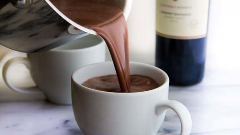 Nagyjából másfél csésze (viszonylag zsíros) tejet és 1/3 csésze apróra tört étcsokoládét olvasszunk fel egy serpenyőben, és folyamatosan kevergessük, míg a csoki szépen elegyedik a folyadékkal. Ha már megvan a krémes keverék, öntsünk hozzá 1 csésze testes vörösbort, és folytassuk a kevergetést még néhány percig.
