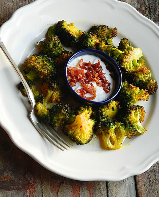 A sütőt elmelegítem 220 fokra, közben egy keverőtálban összekeverem az olajat a fűszerekkel. A brokkolit beleborítom egy nejlonzacskóba, ráöntöm a fűszeres olajat, és alaposan összerázom. Sütőpapírral kibélelt tepsire borítom, a vágási felülettel lefelé fordítva. 18-20 perc alatt készre sütöm. A bacont felkockázom, és egy serpenyőben ropogósra sütöm. Leitatom a zsírját, hagyom hűlni, majd összekeverem a tejföllel. Együtt fogyasztom. Köretnek is kiváló.