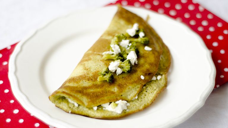 Óvatosan egy tányérra csúsztatjuk. Az egyik felére a maradék brokkoliból halmozunk, amit elmorzsolt fetával szórunk meg, majd ráhajtjuk a másik felét.