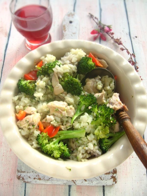A brokkolit mossuk meg, és szedjük rózsáira, a kelkáposztát vágjuk csíkokra. A rizst öblítsük át! Kevés olajon pirítsuk meg a felszeletelt vöröshagymát, adjuk hozzá a kockára vágott csirkét, és erős tűzön pároljuk fehéredésig. Adjuk hozzá a csíkokra vágott kelkáposztát, pároljuk rövid ideig, majd adjuk hozzá a rizst, és öntsük fel a borral. Amikor elpárolog, adjunk hozzá még fél liter vizet vagy húslevesalaplét. Főzzük félpuhára a rizst, adjuk hozzá a rózsáira szedett brokkolit, és pároljuk együtt néhány percig. Fűszerezzük sóval, borssal, keverjük jól össze, és töltsük át egy jénai tálba a levével együtt. Ha szükséges, önthetünk még alá egy kevés fehér bort vagy levesalapot, amit majd sütés alatt magába szív. 180 fokra előmelegített sütőben süssük még további 15 percig. Szórhatunk rá reszelt sajtot is.