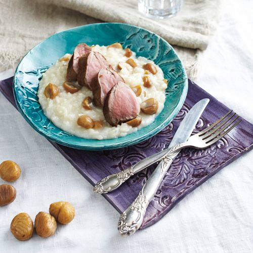 A sertésszüzet megtisztítjuk, sózzuk, majd felforrósított serpenyőben fél evőkanál vajon minden oldalát megpirítjuk, 1-1 perc alatt. Tepsibe emeljük, utána 200 ˚C-ra előmelegített sütőbe tesszük 6-8 percre. Lekapcsoljuk a sütőt, kinyitjuk az ajtaját, és még 10 percig pihentetjük a húst. A rizottóhoz a hagymát megtisztítjuk, apróra vágjuk, és az olajon dinsztelni kezdjük. Amikor üveges, hozzáadjuk a rizst, és 2 percig hevítjük. Felöntjük a borral, és hagyjuk, hogy elpárologjon. Ezután merőkanalanként adagoljuk bele az előzőleg felforralt alaplevet, mindig akkor adjuk hozzá a következőt, amikor az előzőt beszívta. 10 perc után belekeverjük a negyedekre vágott hámozott gesztenyét, sózzuk, borsozzuk, és tovább főzzük. (Kb. 20 perc alatt készül el.) A legvégén hozzáadjuk a maradék vajat, sózzuk, borsozzuk, és a felszeletelt hússal tálaljuk.