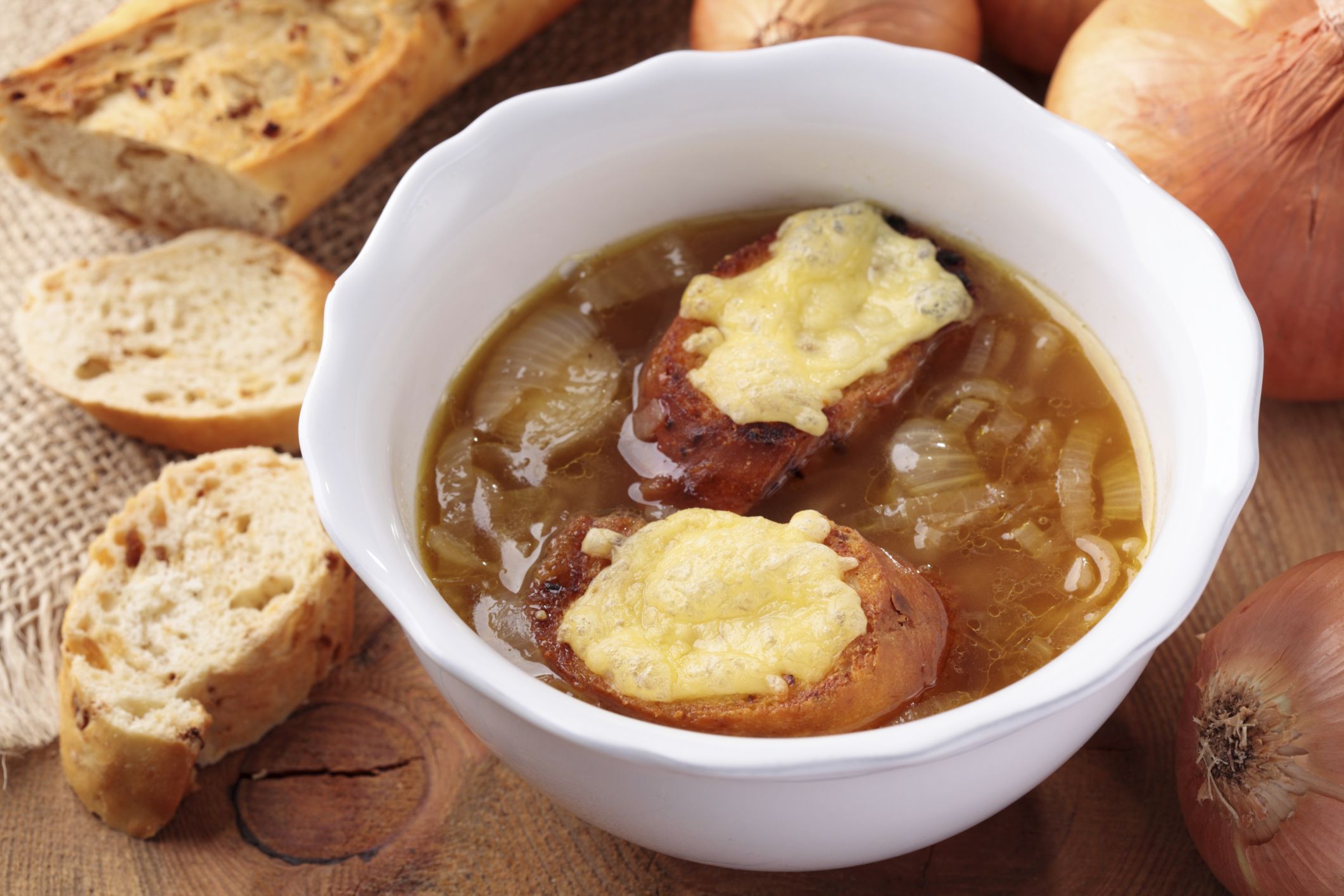 A vajat felolvasztjuk egy vastag aljú lábosban, és rádobjuk a hagymát. Kis lángon 25 perc alatt egyenletesen barnára pároljuk, kissé karamellizáljuk a hagymát, közben időnként megkeverjük. A fokhagymát és a lisztet a lábosba szórjuk és 2 percig folyamatosan kevergetjük, lassan hozzáöntjük a bort és a levest, felforraljuk, és közben is folyamatosan kevergetjük. Beledobjuk a babérlevelet, a kakukkfüvet, és fűszerezzük. A lábosra fedőt teszünk, 25 percig hagyjuk főni, majd a végén a kakukkfüvet és a babérlevelet kiszedjük. A bagett- vagy kifliszeleteket sütőben vagy grillen megpirítjuk, levesestányérba helyezzük, forró hagymalevest kanalazunk rá, reszelt sajttal megszórjuk, és visszatoljuk a sütőbe a levesestálakat, amíg a sajt rá nem olvad.