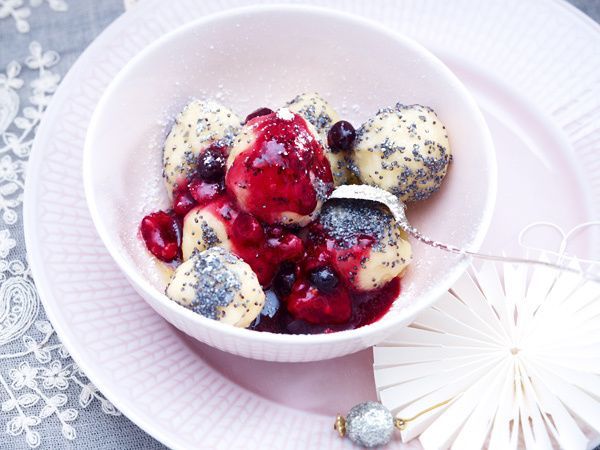 100 g vajat megolvasztunk, majd 1 kanál cukorral, a túróval, a vaníliás cukorral és egy csipet sóval összedolgozzuk. A 100 g lisztet hozzákeverjük, a masszát 20 percig állni hagyjuk. A gyümölcslevet 4 evőkanál cukorral felforraljuk. A keményítőt 3 evőkanál lével csomómentesre keverjük, majd hozzáadjuk a cseresznyeléhez. 2 percig főzzük, majd hozzáadjuk a mélyhűtött gyümölcsöket. Egy lábasban sós vizet forralunk, a túrós masszából kis golyókat formálunk, lisztben megforgatjuk, majd 5 percig főzzük. A mákot zsiradék nélkül kissé megpirítjuk, hozzáadunk 2 evőkanál vajat, tovább pirítjuk. A golyócskákat a mákos vajban megforgatjuk, porcukorral megszórjuk, és az erdei gyümölcsös szósszal tálaljuk.