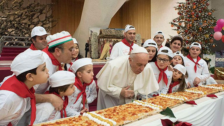 Olaszországban gyakran készítenek ünnepségekre kerek helyett hosszúkás pizzát. A pápa születésnapi tortát helyettesítő négyméteres pizzáját egy hosszú asztalon állították össze téglalap alakúra sütött és egymáshoz illesztett pizzákból. Az asztal közepén egy szál fehér gyertya állt.