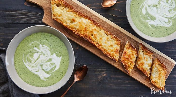 A joghurtot keverjük össze a lime-mal! A levest tálaljuk hidegen a lime-os joghurttal a tetején, adjuk mellé a sajtos bagettet!
