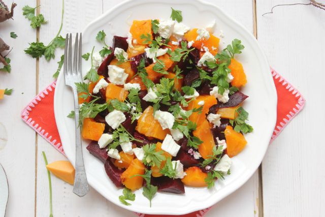 A puhára sült céklát és sütőtököt tálra szedjük, rámorzsoljuk a fetát, és megszórjuk aprított petrezselyemmel.