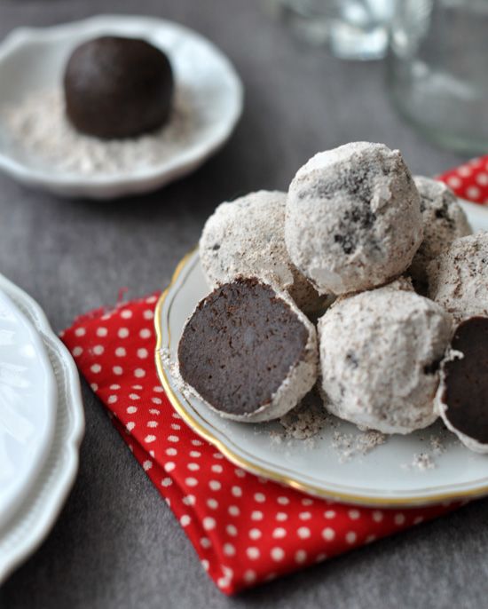 A masszát hűtőbe tesszük minimum egy éjszakára, majd közvetlenül tálalás előtt gyors mozdulatokkal gombócokat formázunk belőle, és darált mandulában vagy cukrozatlan kakaóporban hempergetjük meg őket.